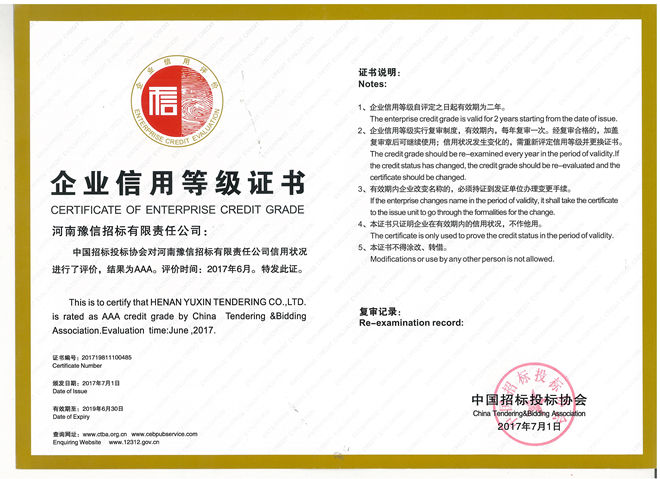 中國(guó)招投標(biāo)協(xié)會(huì)3A企業(yè)信用等級(jí)證書(shū)
