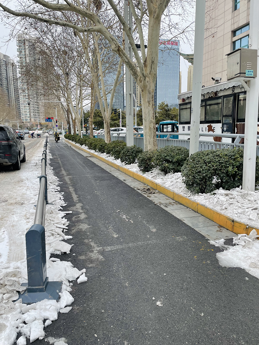 大家用鐵鍬邊敲邊鏟,一點點“攻克”堅硬厚實的冰層,經(jīng)過共同努力,非機動車道的冰層積雪徹底清除,最終在凍雪中鏟出一條“安心路”,有效保障了附近來往群眾的安全通行。