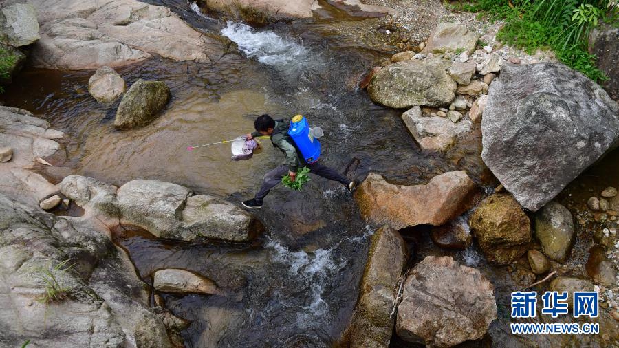 烏英苗寨水果種植專業(yè)合作社負(fù)責(zé)人梁秀前過(guò)河去除草(2019年7月25日攝)。新華社記者 黃孝邦 攝