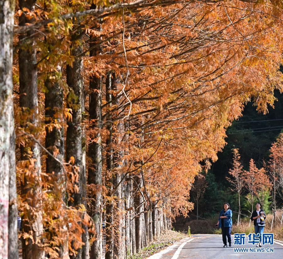 游客在福建省三明市將樂縣龍棲山國(guó)家級(jí)自然保護(hù)區(qū)水杉大道游覽(11月20日攝)。新華社記者 宋為偉 攝