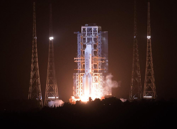 202011244時(shí)30分,中國文昌航天發(fā)射場。長征五號(hào)遙五運(yùn)載火箭尾焰噴薄而出,閃爍著多彩的光芒映透整個(gè)夜空。山坡上、海岸邊,人們歡呼、慶祝,目送長征五號(hào)全力托舉嫦娥五號(hào)向著月球飛馳而去。