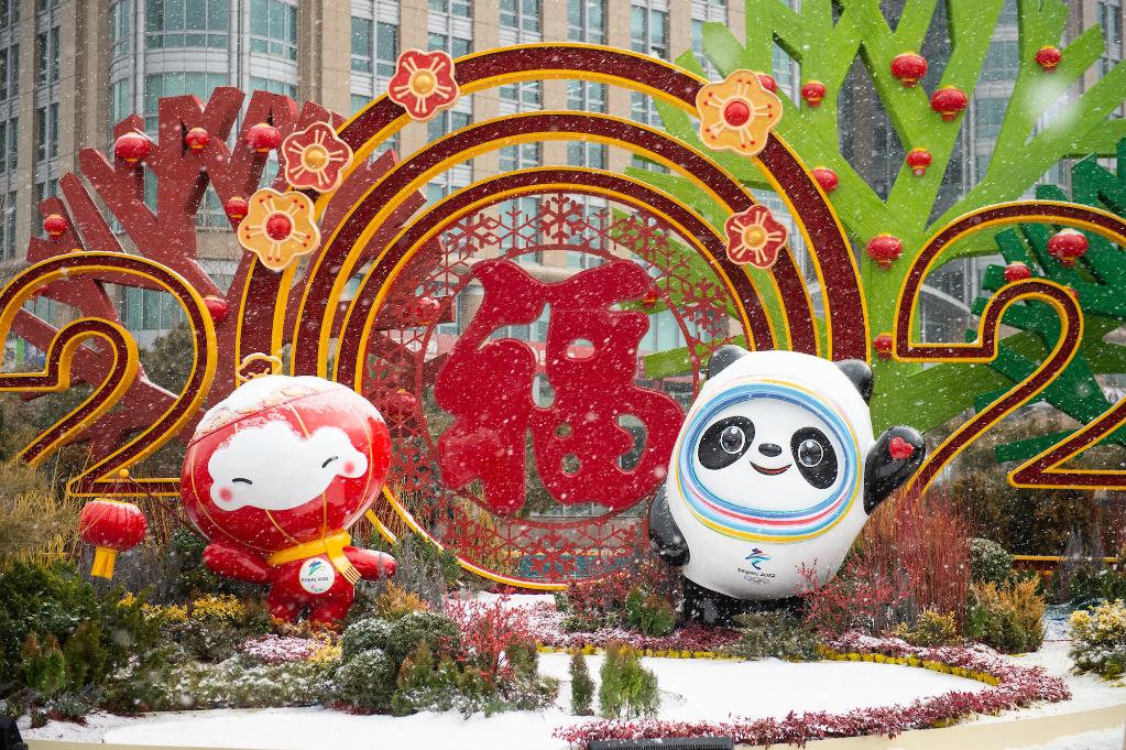 2022年1月20日大寒時節(jié),北京冬奧會“冰墩墩”和冬殘奧會吉祥物“雪容融”景觀在北京東單路口增添節(jié)日的喜慶氣氛。新華社記者 陳鐘昊 攝