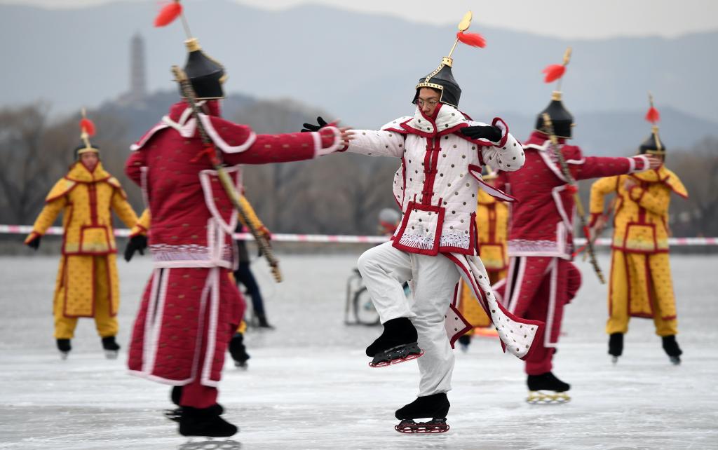 在北京頤和園冰場舉辦的還原清朝八旗官兵冰嬉活動的表演(2018年1月21日攝)。新華社記者 李俊東 攝