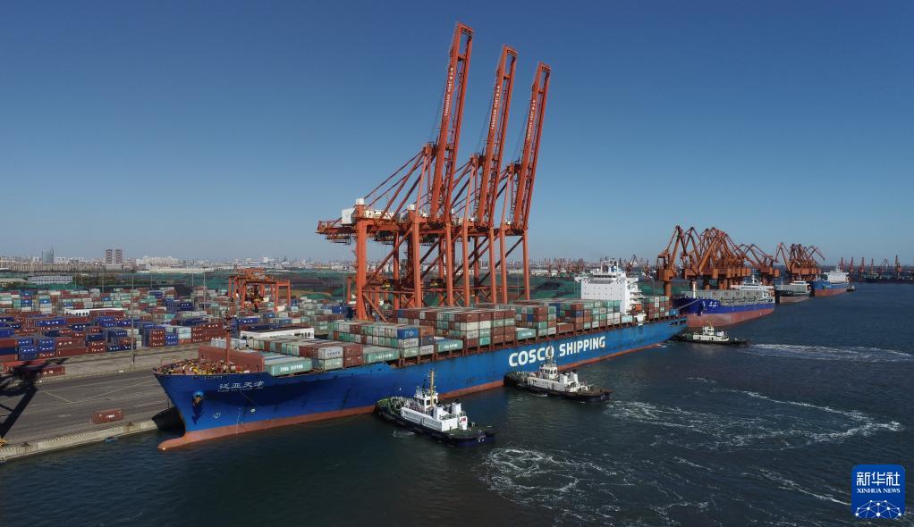 一艘輪船在拖輪的協(xié)助下向唐山港京唐港區(qū)集裝箱碼頭靠泊(2021年10月23日攝,無(wú)人機(jī)照片)。新華社記者 朱旭東 攝