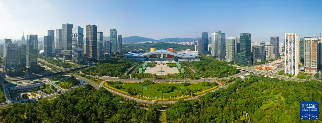 這是深圳市民中心和蓮花山公園一線(xiàn)(2020年10月2日攝,無(wú)人機(jī)照片)。新華社記者 梁旭 攝
