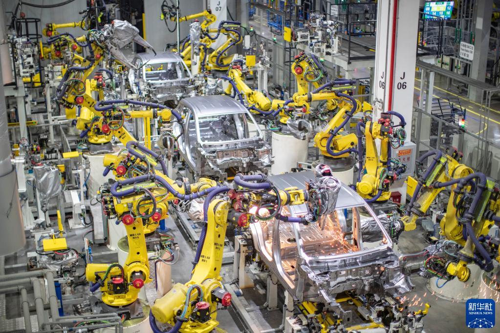 重慶一家新能源汽車(chē)企業(yè)使用智能化焊接機(jī)器人進(jìn)行焊接作業(yè)(2021年4月2日攝)。新華社記者 黃偉 攝