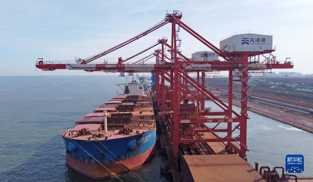 在天津港南疆港區(qū)26泊位,卸船機(jī)在進(jìn)行卸貨作業(yè)(1月28日攝,無人機(jī)照片)。新華社記者 趙子碩 攝