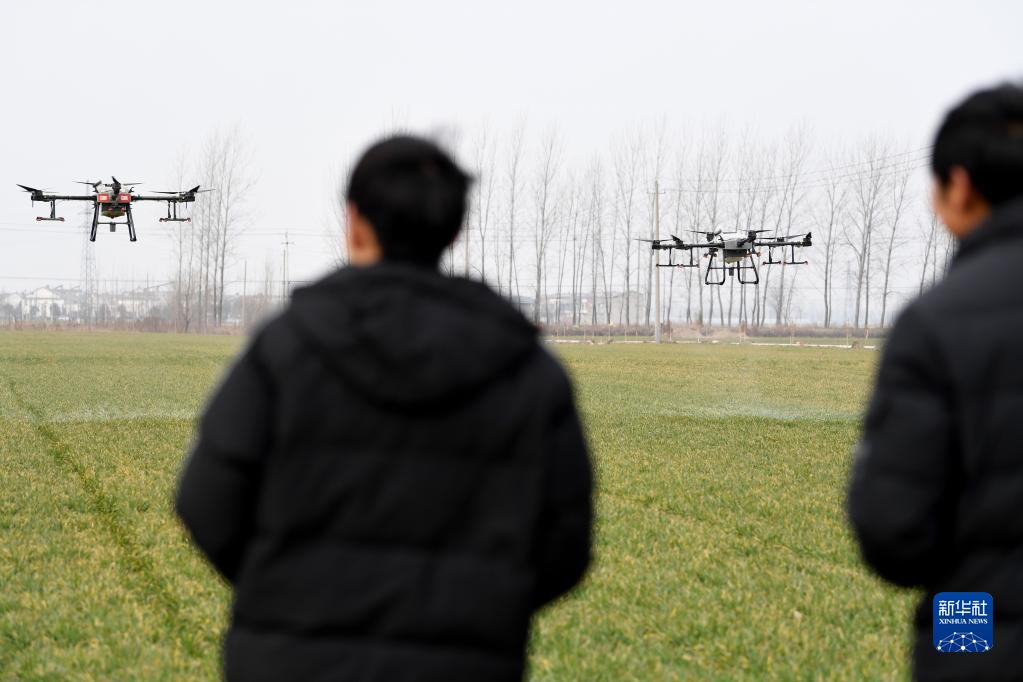 2月11日,無人機(jī)在安徽省亳州市趙橋鄉(xiāng)“無人農(nóng)場(chǎng)”噴灑除草劑。新華社記者 劉軍喜 攝