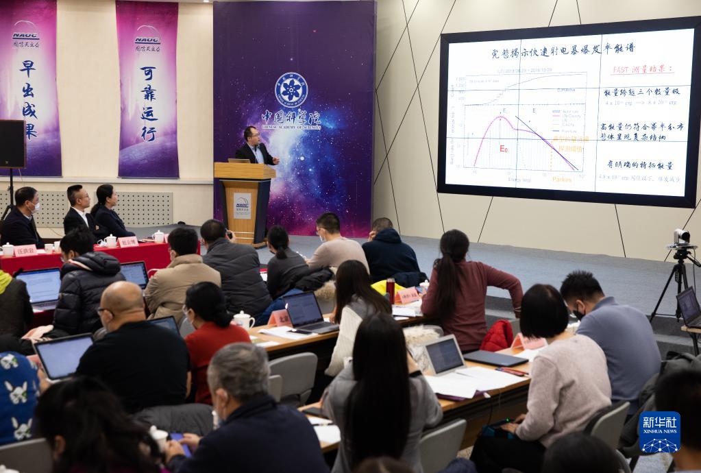 1月5日,在中科院國家天文臺(tái)舉行的新聞發(fā)布會(huì)上,國家天文臺(tái)王培在介紹FAST在快速射電暴領(lǐng)域的重大成果。新華社記者 金立旺 攝