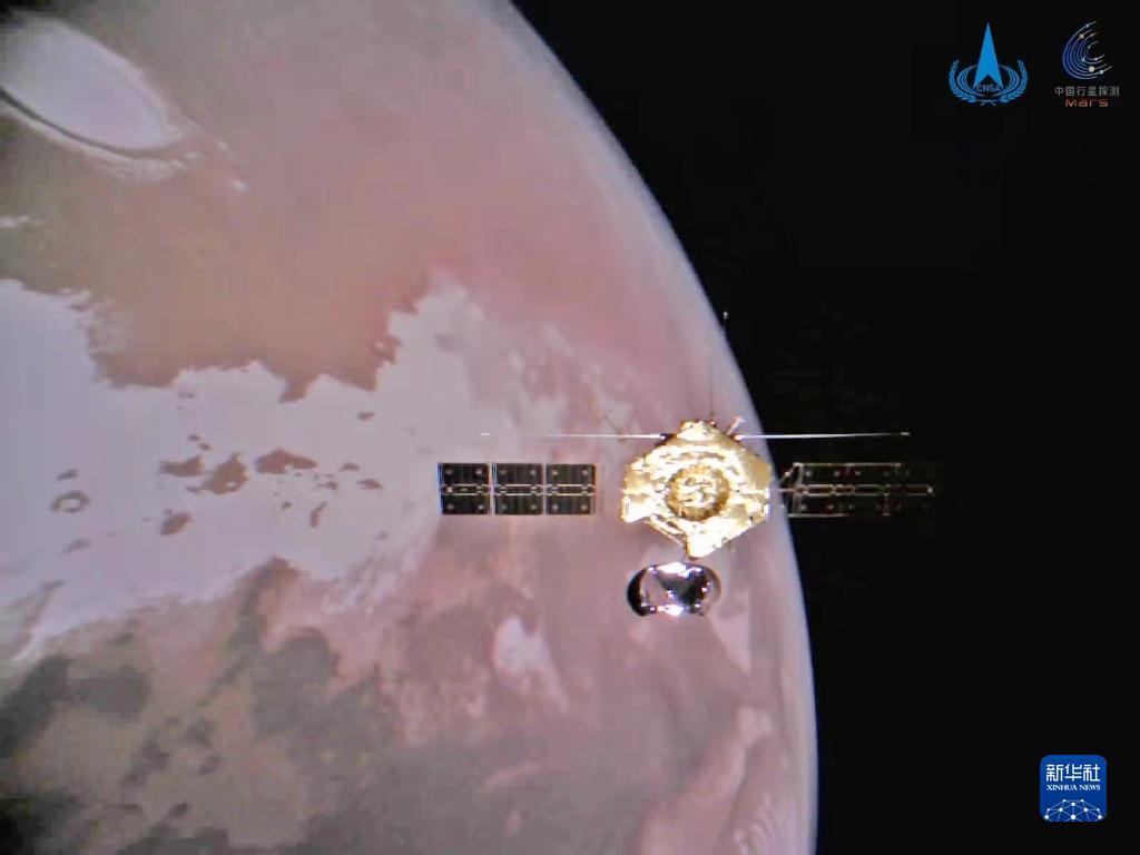 2022年元旦,國家航天局發(fā)布我國首次火星探測(cè)任務(wù)天問一號(hào)探測(cè)器從遙遠(yuǎn)火星傳回的一組精美圖像,向全國人民報(bào)告平安。這是環(huán)繞器與火星合影。新華社發(fā)(國家航天局供圖)