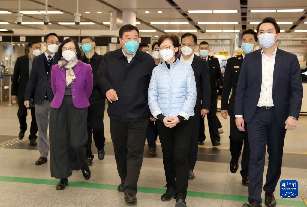 2月28日,香港特區(qū)行政長(zhǎng)官林鄭月娥等赴口岸迎接專家組一行。新華社記者 李鋼 攝
