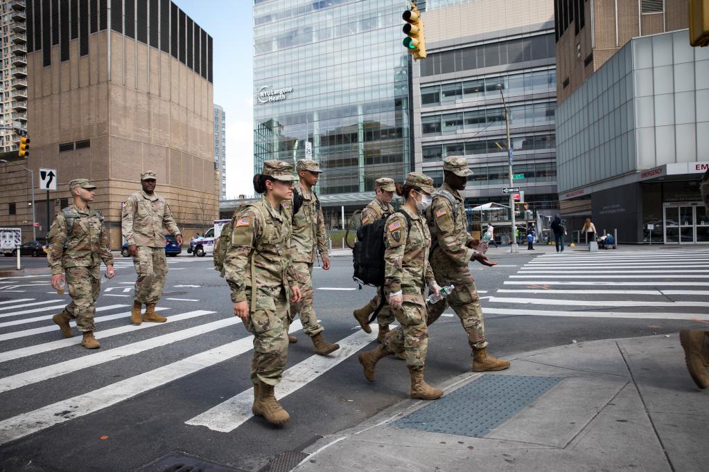 2020年4月8日,在美國紐約,美軍士兵從一家醫(yī)院外走過。新華社發(fā) (郭克攝)