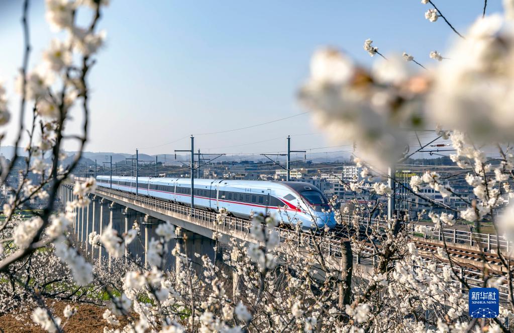 動(dòng)車組列車在成貴高鐵貴州黔西段行駛(2022年3月7日攝)。 新華社發(fā)(范暉 攝)