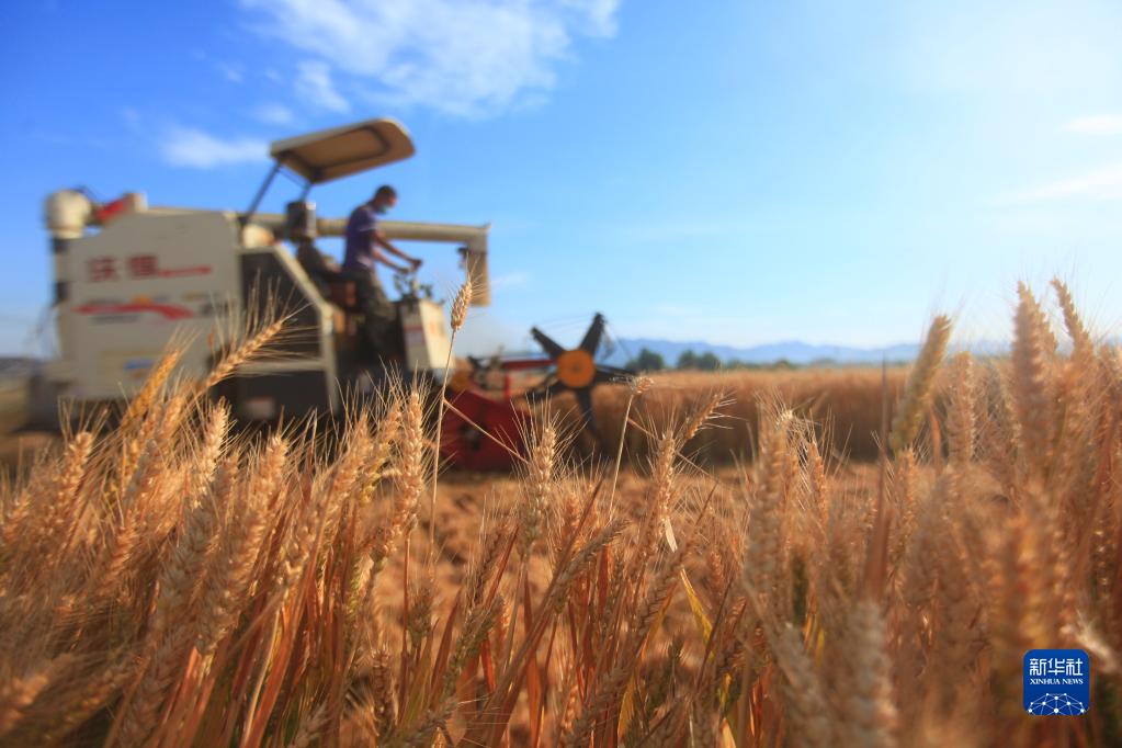 山東省臨沂市平邑縣農(nóng)民駕駛收割機(jī)在田間收獲小麥(2021年6月8日攝)。 新華社發(fā)(武紀(jì)全攝)