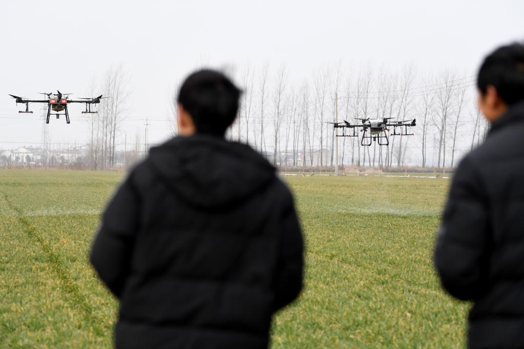 2月11日,亳州市譙城區(qū)趙橋鄉(xiāng)“無(wú)人農(nóng)場(chǎng)”無(wú)人機(jī)在噴灑除草劑。新華社記者劉軍喜攝