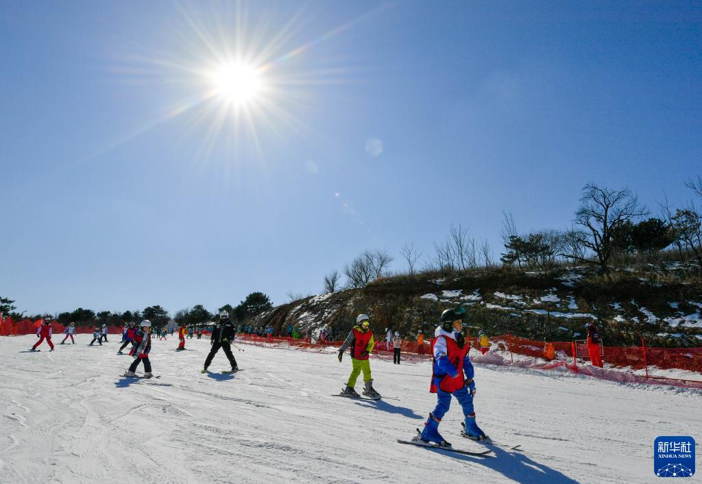 在天津薊洲國際滑雪場,教練與小朋友在雪道上練習(xí)滑雪(2月20日攝)。新華社記者 孫凡越 攝