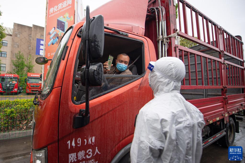 4月13日,工作人員查驗(yàn)駛?cè)牒贾輦骰犯鄣呢涇囁緳C(jī)健康碼。新華社記者 江漢 攝