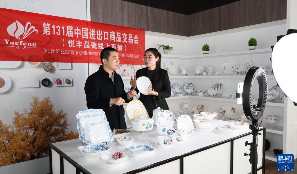 4月15日,第131屆中國進(jìn)出口商品交易會線上開幕。在江蘇省淮安市洪澤區(qū),一家陶瓷企業(yè)的工作人員在展廳直播介紹產(chǎn)品。新華社發(fā)(趙啟瑞 攝)