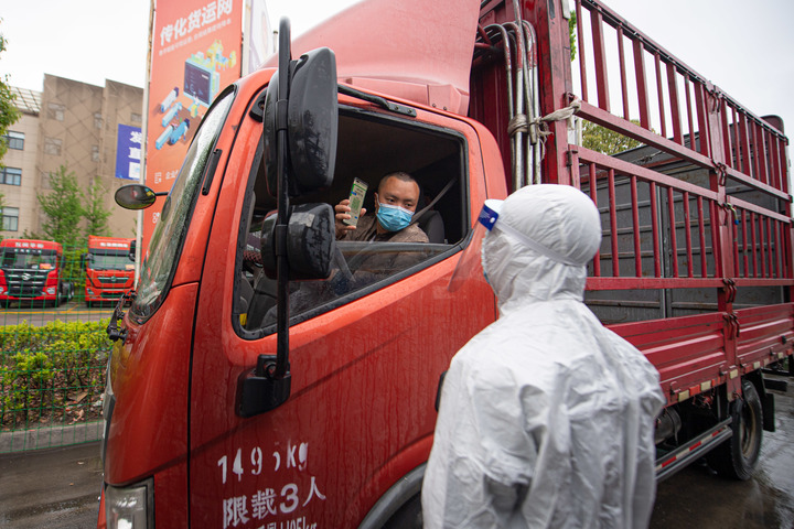 4月13日,工作人員查驗駛?cè)牒贾輦骰犯鄣呢涇囁緳C健康碼。新華社記者江漢 攝