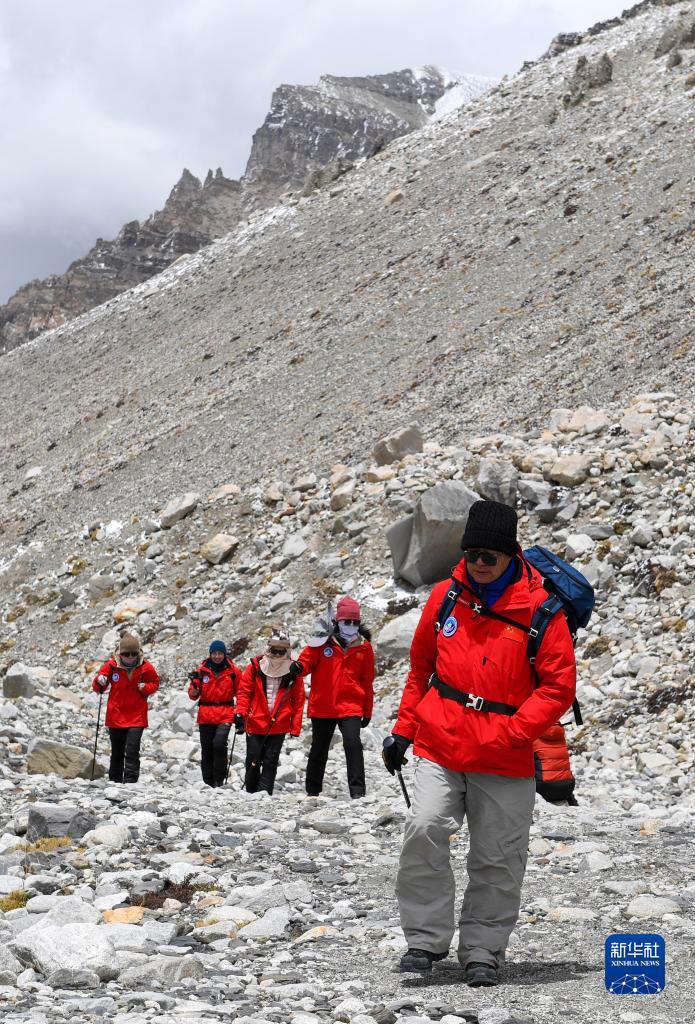 朱彤(右一)和科研人員在珠峰大本營和東絨布冰川間徒步穿梭(5月1日攝)。新華社記者 姜帆 攝