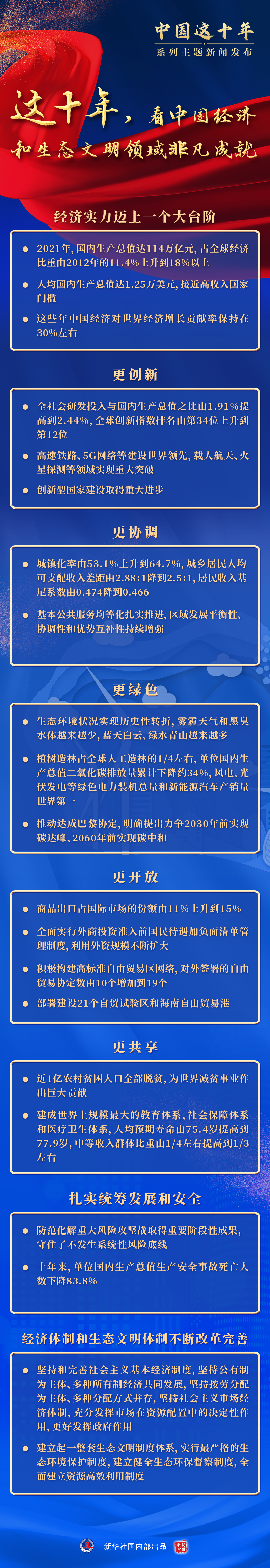 這是我國經(jīng)濟(jì)實力又邁上一個大臺階的十年,這是扎實推進(jìn)創(chuàng)新發(fā)展、協(xié)調(diào)發(fā)展、綠色發(fā)展、開放發(fā)展、共享發(fā)展的十年,這是扎實統(tǒng)籌發(fā)展和安全的十年,這是經(jīng)濟(jì)體制和生態(tài)文明體制不斷改革完善的十年……