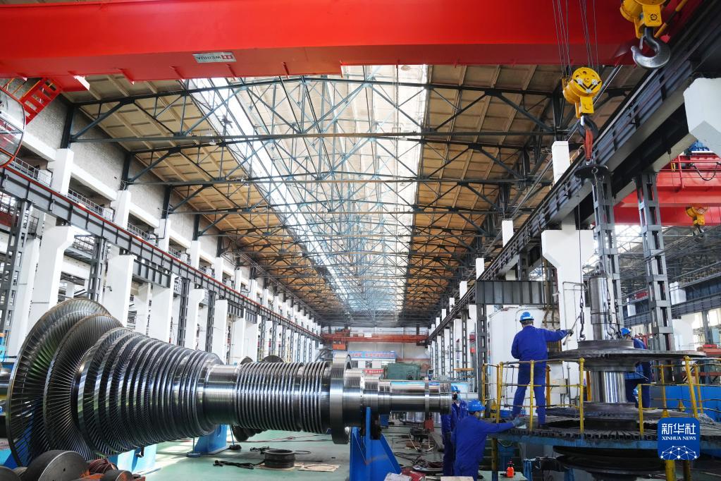 在哈電集團(tuán)哈爾濱汽輪機(jī)廠有限責(zé)任公司生產(chǎn)車間,工人在生產(chǎn)作業(yè)(5月7日攝)。新華社記者 王建威 攝