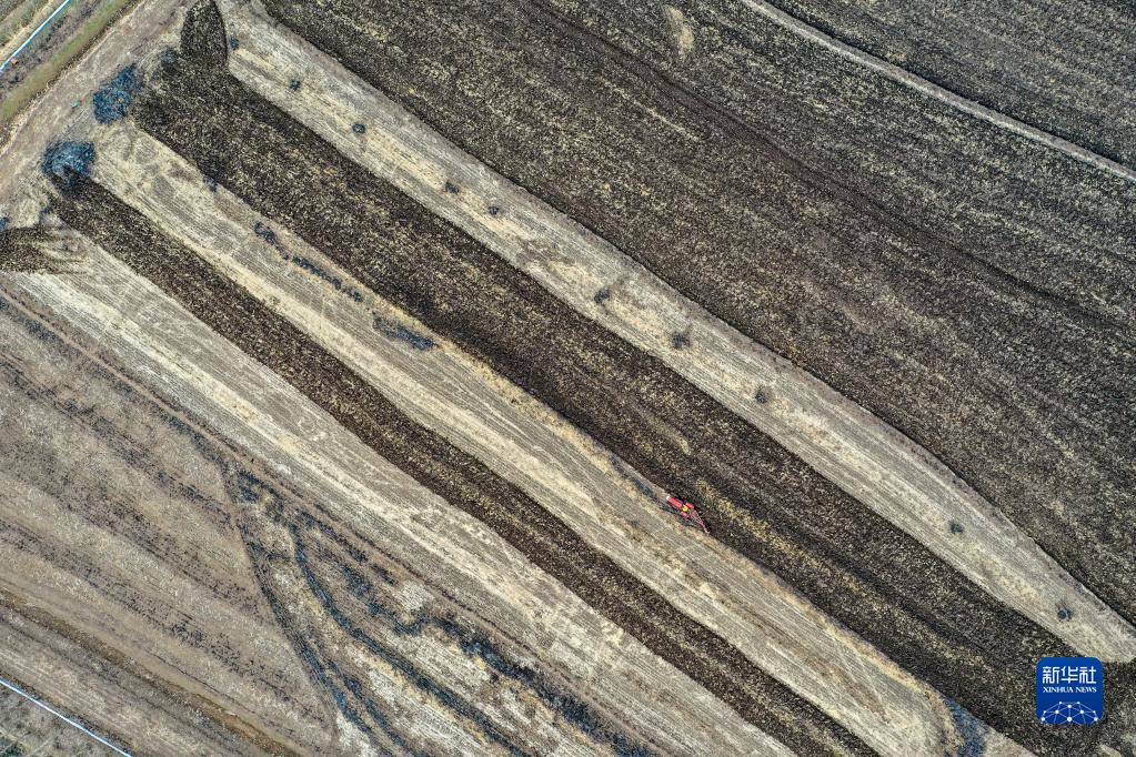 在吉林省吉林市昌邑區(qū)孤店子鎮(zhèn)紅衛(wèi)村,春新生態(tài)家庭農(nóng)場農(nóng)民駕駛農(nóng)機(jī)耕地(4月26日攝,無人機(jī)照片)。新華社記者 張楠 攝