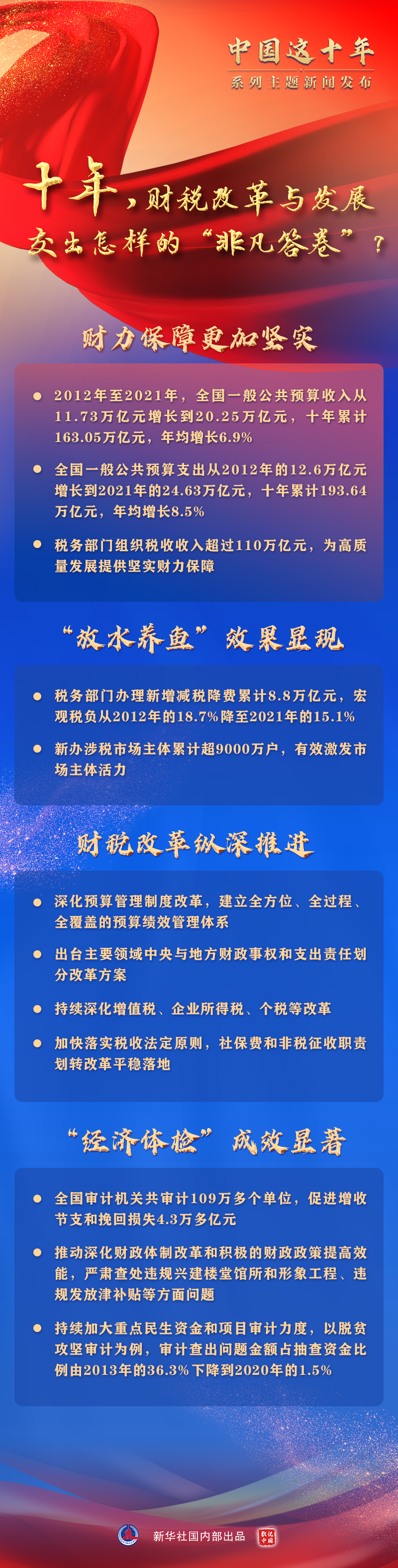 深化預(yù)算管理制度改革,建立全方位、全過程、全覆蓋的預(yù)算績效管理體系;出臺主要領(lǐng)域中央與地方財政事權(quán)和支出責(zé)任劃分改革方案;持續(xù)深化增值稅和企業(yè)所得稅改革,初步建立綜合與分類相結(jié)合的個人所得稅制度;強(qiáng)化財會監(jiān)督,嚴(yán)格財經(jīng)紀(jì)律……十年來,財稅體制改革縱深推進(jìn)。