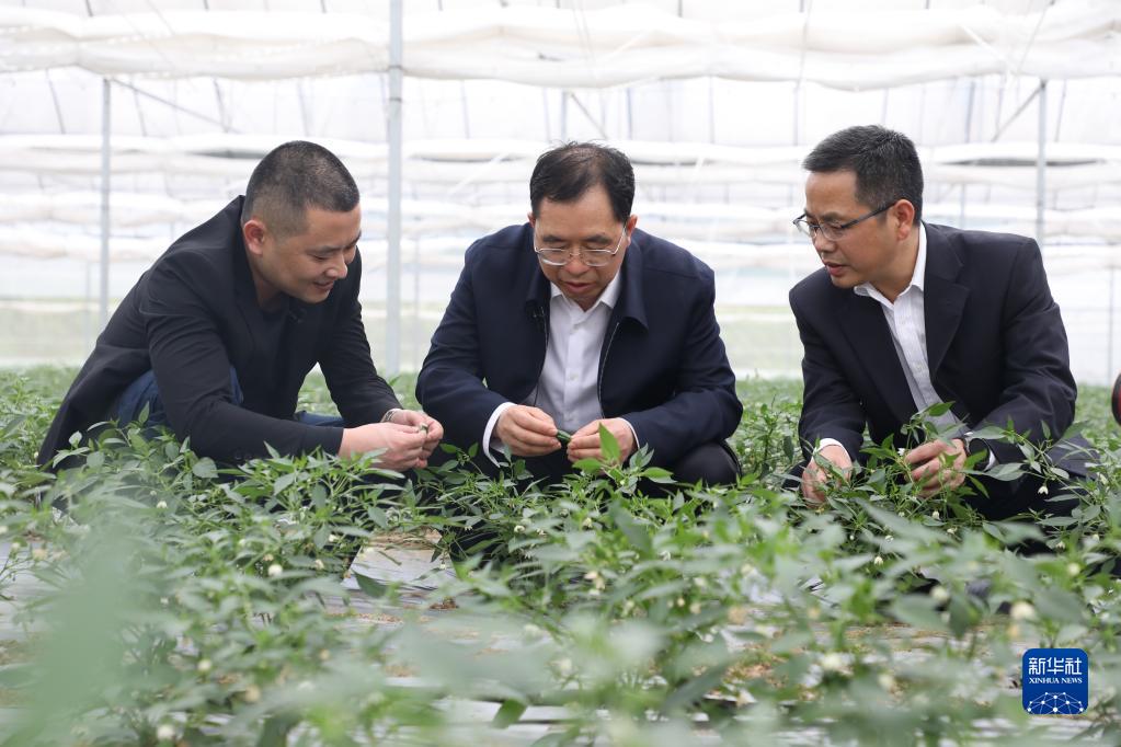 中國工程院院士、湖南農業(yè)大學校長鄒學校(中)在樟樹鎮(zhèn)的辣椒基地查看辣椒長勢(資料照片)。新華社發(fā)(湖南農業(yè)大學供圖)