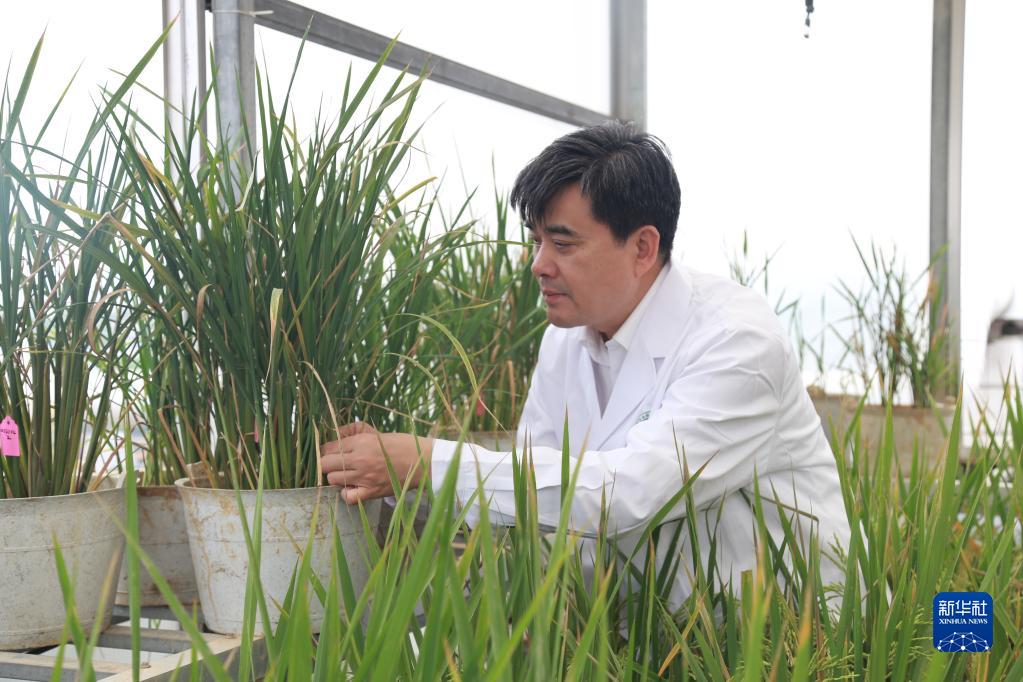 中國工程院院士、湖南省農業(yè)科學院黨委書記柏連陽在實驗室查看水稻生長情況(資料照片)。新華社發(fā)(受訪者供圖)