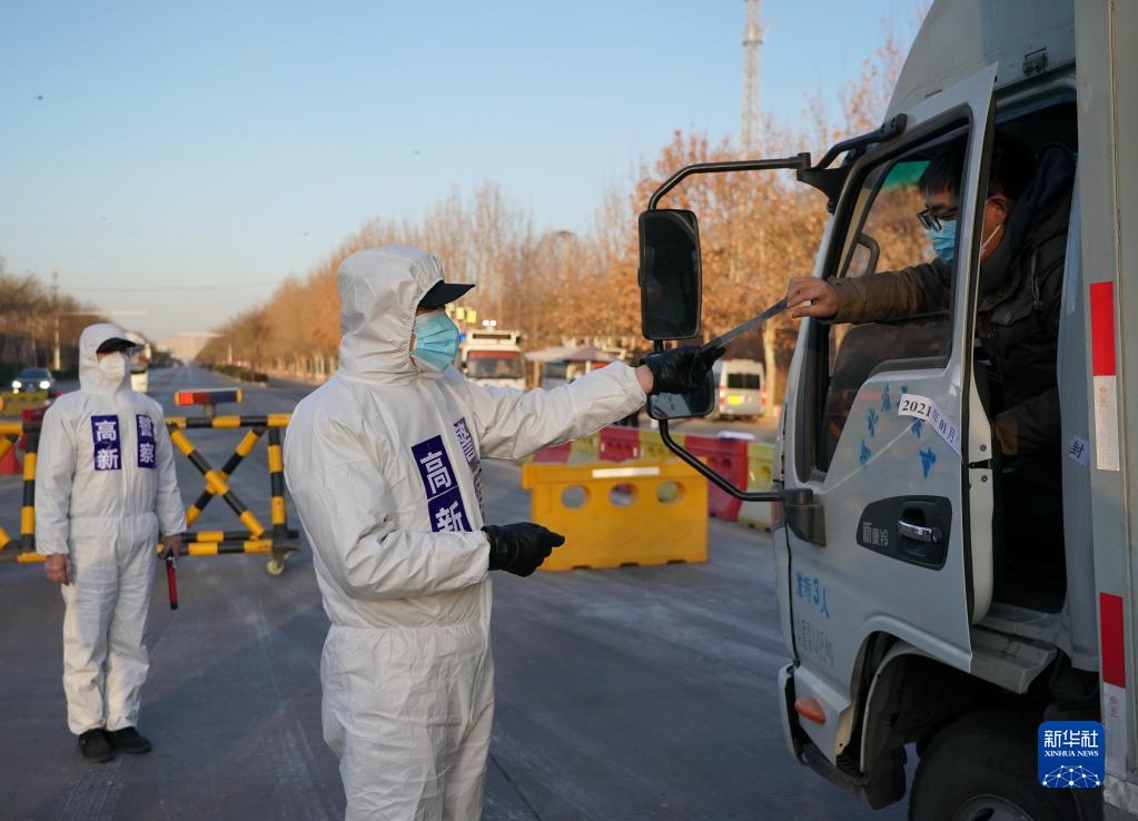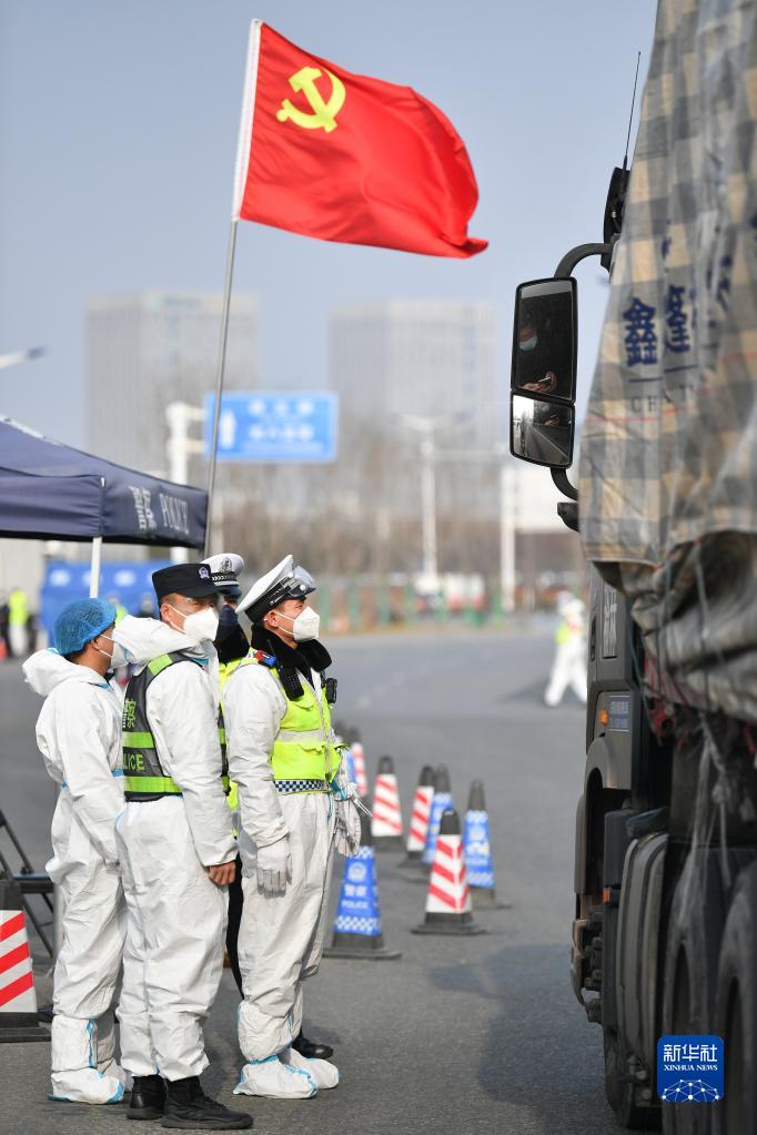 石家莊市公安局高新技術產業(yè)開發(fā)區(qū)公安分局民警在藁城區(qū)通往市區(qū)的路口執(zhí)勤(2021年1月10日攝)。當日是首個“中國人民警察節(jié)”。新華社記者 楊世堯 攝