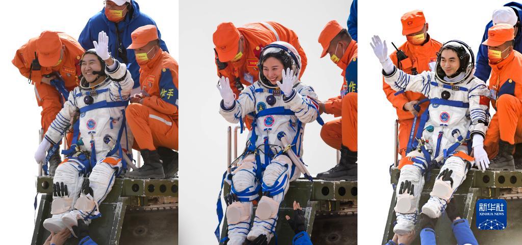 4月16日,神舟十三號載人飛船返回艙在東風著陸場成功著陸。這是航天員翟志剛、王亞平、葉光富(左至右)安全順利出艙(拼版照片)。新華社發(fā)