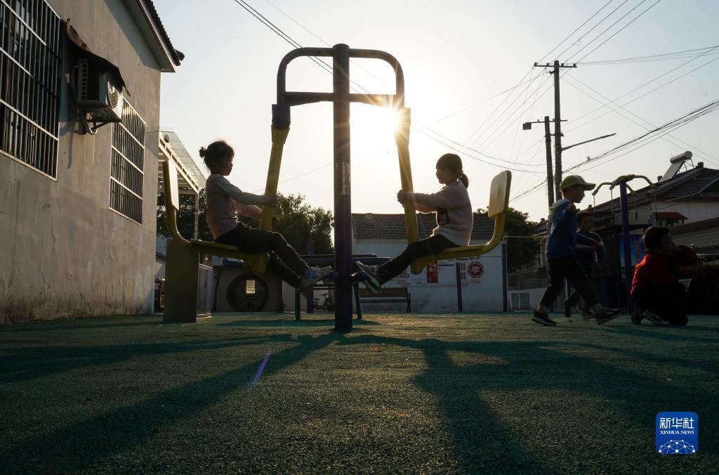 小朋友在鎮(zhèn)江市世業(yè)鎮(zhèn)永茂圩自然村的文化活動(dòng)廣場(chǎng)玩耍(2020年4月13日攝)。新華社記者 季春鵬 攝