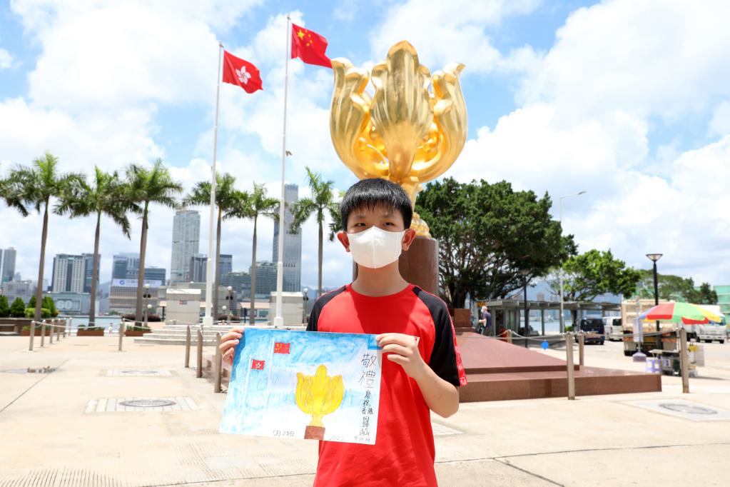 香港小學(xué)生曾祥珂帶著自己的畫作《敬禮——慶祝香港回歸25周年》,在父母陪伴下來(lái)到金紫荊廣場(chǎng)留影,迎接香港回歸25周年。新華社記者 吳曉初 攝