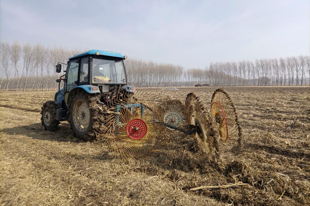 2022年4月4日,吉林德強種植業(yè)家庭農(nóng)場農(nóng)民在田間進行秸稈歸行作業(yè)。新華社發(fā)