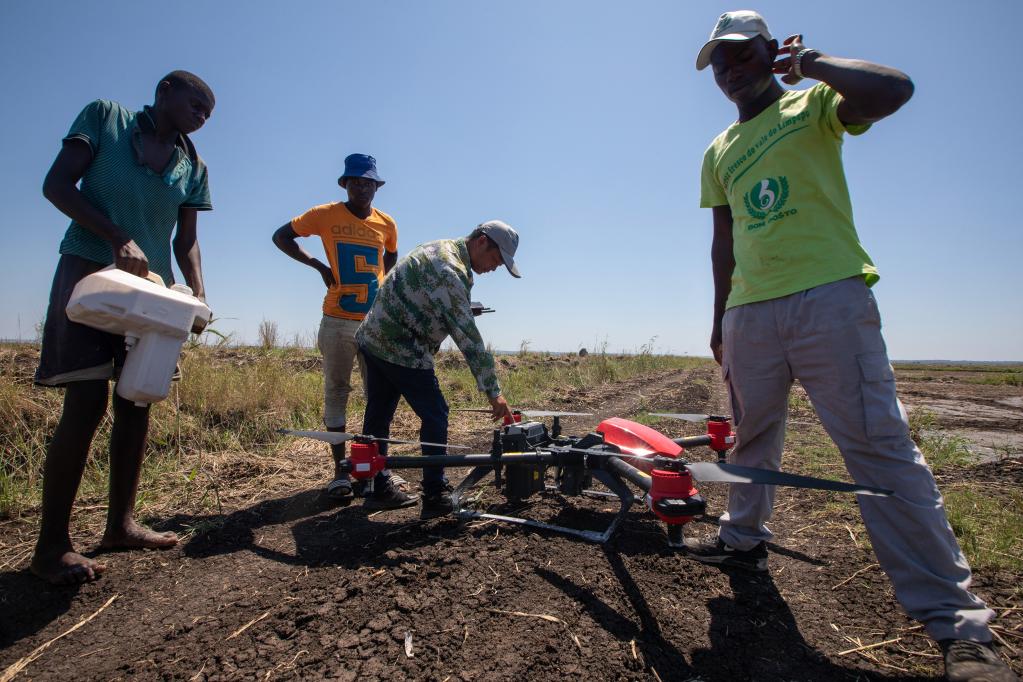 2019年11月28日,在莫桑比克的萬寶莫桑農(nóng)業(yè)園,中國農(nóng)業(yè)專家(右二)指導當?shù)毓と耸褂脽o人機噴灑除草劑。新華社記者 張宇 攝