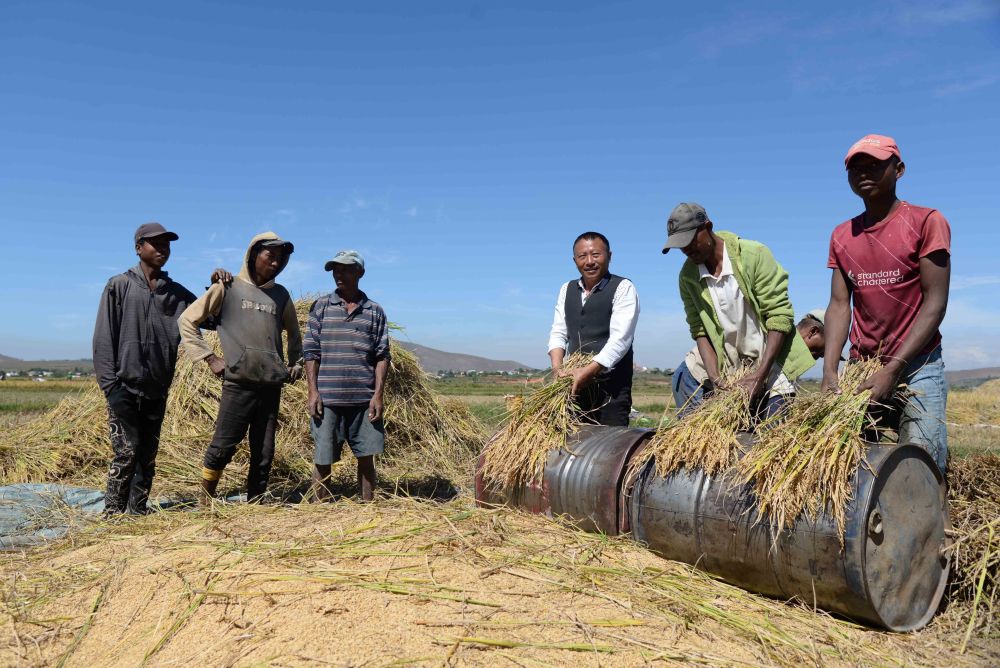 在馬達(dá)加斯加首都塔那那利佛附近的馬義奇鎮(zhèn),中國雜交水稻技術(shù)專家胡月舫(右三)在中國國家雜交水稻工程技術(shù)研究中心非洲分中心的試驗(yàn)田里和當(dāng)?shù)剞r(nóng)民一起收獲水稻(2023年5月12日攝)。新華社發(fā)(西塔卡·拉喬納里松攝)