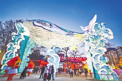 ??經(jīng)過快捷有序安檢,游客魚貫而入。這里不僅有金黃銀杏葉組成的“姓氏起源”樹,還有巨大鯨魚與藍(lán)色波浪融為一體的“海晏河清”燈組。記者從現(xiàn)場了解到,“鯨魚”正下方就是主會場,不定時會有各種節(jié)目表演來充當(dāng)氛圍組。不一會兒,憨態(tài)可掬的“祝融熊貓”、悠揚(yáng)動聽的民族樂器、精彩絕倫的“木偶變臉”就在這兒輪番上演,引得圍觀人群歡呼連連。