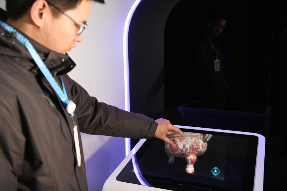 ??在安徽東超科技有限公司,工作人員演示空中成像互動(dòng)查詢臺(tái)。