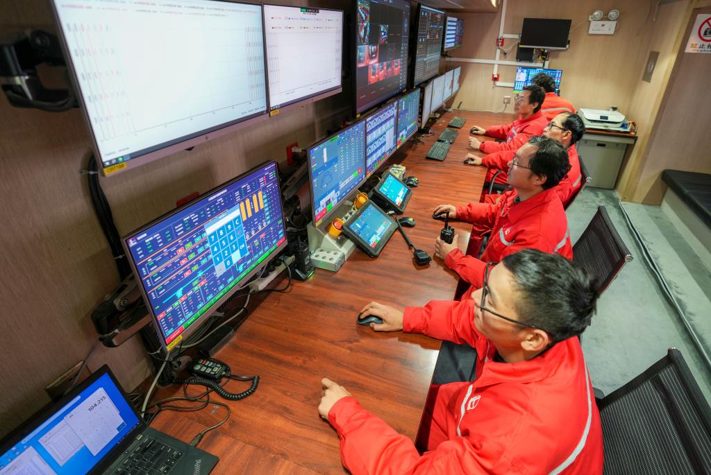 ??技術(shù)人員在重慶涪陵頁(yè)巖氣田焦頁(yè)5號(hào)電驅(qū)壓裂平臺(tái)控制室作業(yè)。