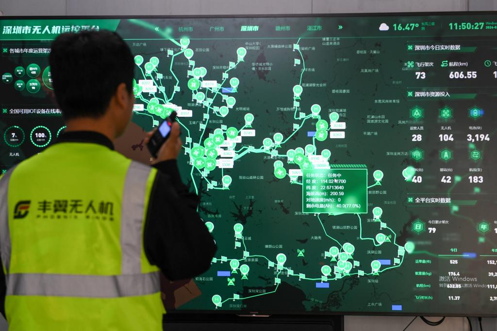 ??在豐翼科技(深圳)有限公司運(yùn)營(yíng)中心,機(jī)長(zhǎng)對(duì)無(wú)人機(jī)進(jìn)行調(diào)度。