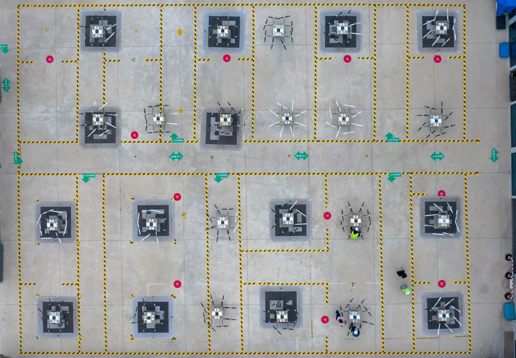 ??在豐翼無(wú)人機(jī)運(yùn)營(yíng)中心,地勤人員對(duì)無(wú)人機(jī)進(jìn)行起飛前的檢查(無(wú)人機(jī)照片)。