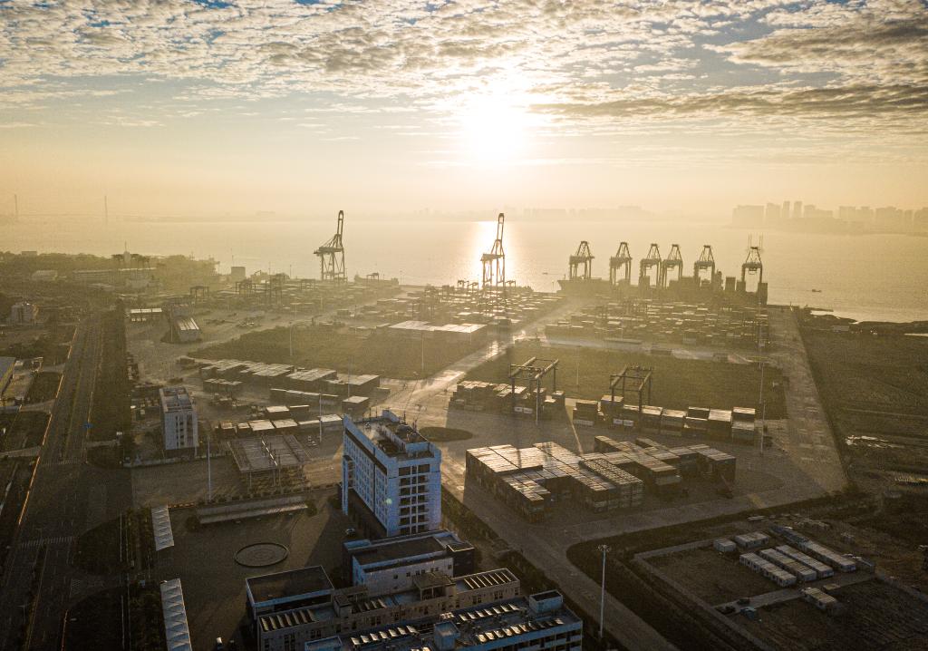 ??2024年1月1日在海南省洋浦經(jīng)濟(jì)開(kāi)發(fā)區(qū)拍攝的海南自貿(mào)港集裝箱航運(yùn)樞紐——洋浦國(guó)際集裝箱碼頭(無(wú)人機(jī)照片)。新華社記者 蒲曉旭 攝