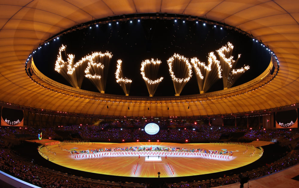 ??這是2023年7月28日拍攝的第31屆世界大學(xué)生夏季運動會開幕式焰火。新華社記者 江宏景 攝