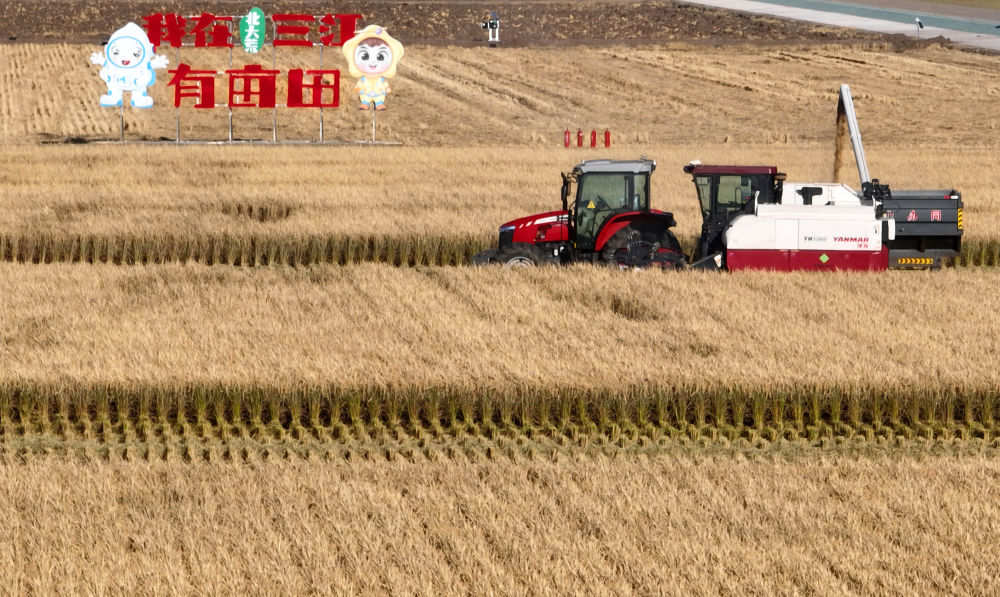 ??龍江大地,金風送爽,稻浪滾滾。建三江七星農場萬畝大地號豐收在望,10臺收割機一字排開,正在實施聯(lián)合作業(yè)。