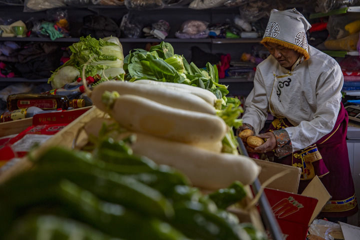 ??在西藏那曲市申扎縣馬躍鄉(xiāng)貝嘎四村偏遠(yuǎn)鄉(xiāng)鎮(zhèn)果蔬配送試點(diǎn)項(xiàng)目直銷(xiāo)點(diǎn),店主西熱加措在整理供銷(xiāo)合作社配送來(lái)的新鮮蔬菜(2024年1月5日攝)。新華社記者 姜帆 攝