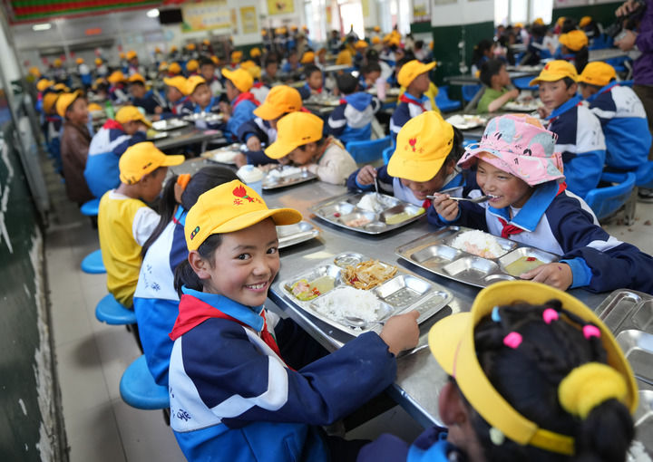 ??西藏林芝市工布江達(dá)縣娘蒲鄉(xiāng)中心小學(xué)學(xué)生在食堂用餐(2024年9月3日攝)。新華社記者 晉美多吉 攝