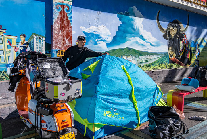 ??經(jīng)國(guó)道318線(xiàn)前往西藏旅游的重慶游客張靜在芒康縣如美鎮(zhèn)拉烏村整理帳篷(2023年10月20日攝)。新華社記者 孫非 攝