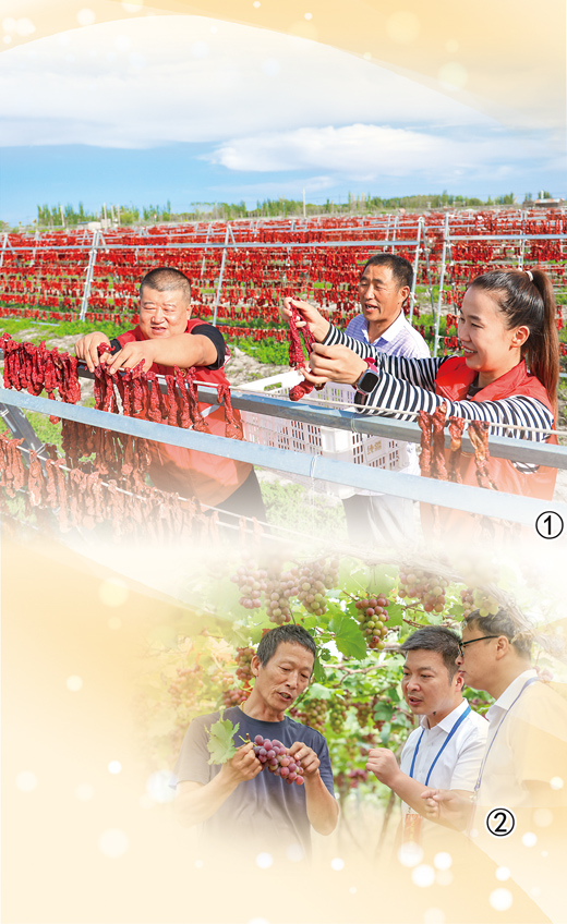 圖①:新疆維吾爾自治區(qū)博湖縣塔溫覺肯鄉(xiāng)辣椒曬場上,黨員志愿服務(wù)隊幫助村民晾曬辣椒。 |